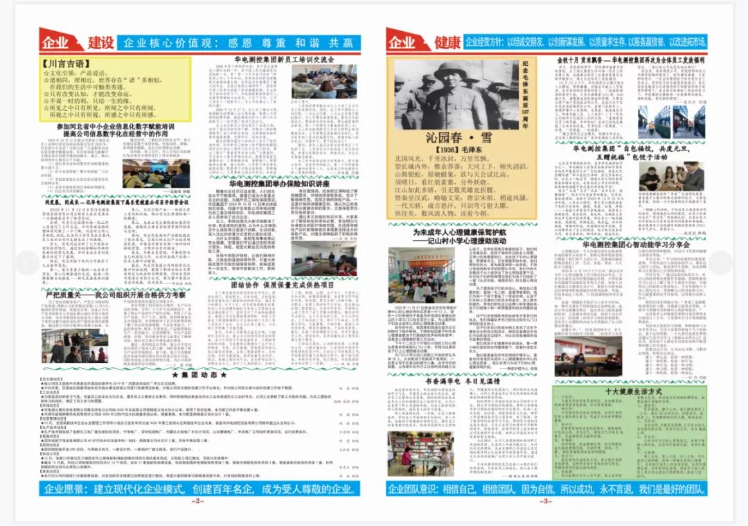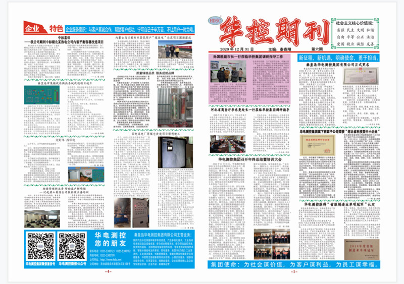 華電測(cè)控期刊自創(chuàng)建成立以來(lái),以集團(tuán)各子公司發(fā)展主營(yíng)業(yè)務(wù)、黨建活動(dòng)、情感護(hù)理、健康管理為內(nèi)容,旨在向大家宣傳公司的企業(yè)文化和致力于打造“華電測(cè)控”品牌形象,堅(jiān)持為社會(huì)謀價(jià)值、為客戶謀利益、為員工謀幸福的集團(tuán)使命;堅(jiān)持建立現(xiàn)代化企業(yè)模式、創(chuàng)建百年名企、成為受人尊敬企業(yè)的集團(tuán)愿景;堅(jiān)持“以坦誠(chéng)交朋友、以創(chuàng)新謀發(fā)展、以質(zhì)量求生存、以服務(wù)贏信譽(yù)、以改進(jìn)拓市場(chǎng)”的企業(yè)經(jīng)營(yíng)方針;以“坦誠(chéng)、負(fù)責(zé)、團(tuán)結(jié)、自信、克難、開拓”的企業(yè)精神為行為導(dǎo)向;在持續(xù)發(fā)展中展示“務(wù)實(shí)、創(chuàng)新、超越、追求世界先進(jìn)水平”的企業(yè)宗旨;秉承“創(chuàng)新進(jìn)取、一流品牌、誠(chéng)實(shí)守信、增值服務(wù)、持續(xù)改進(jìn)、用戶滿意”的企業(yè)質(zhì)量方針;營(yíng)造“感恩、尊重、和諧、共贏”的企業(yè)文化氛圍。