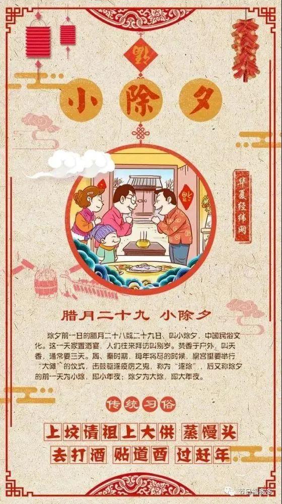 除夕前一日的臘月二十八或二十九日,叫小除夕,中國(guó)民俗文化。這一天家置酒宴,人們往來拜訪叫別歲。焚香于戶外,叫天香,通常要三天。