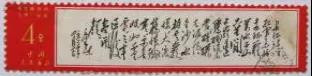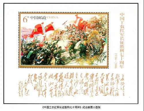 中國郵政曾經發(fā)行的一套《毛主席詩詞》文革郵票,圖案均為毛澤東的詩詞手書。其中《毛主席詩詞》郵票第八枚《七律?長征》,是毛澤東在長征期間創(chuàng)作的最為經典的一首,寫于1935年秋天,當時中央紅軍已走過最艱難的路程,即將與陜北紅軍勝利會師。全詩極其精煉地概括了紅軍長征的戰(zhàn)斗歷程,是紅軍長征的全面總結,表現(xiàn)了紅軍的偉大形象和樂觀主義精神,展現(xiàn)了一幅雄偉壯麗的歷史畫卷。毛澤東的這首詩影響最大、傳播最廣。這首詩的手書還出現(xiàn)在2006年10月22日發(fā)行的《中國工農紅軍長征勝利七十周年》紀念郵票小型張“大會師”的邊紙上。