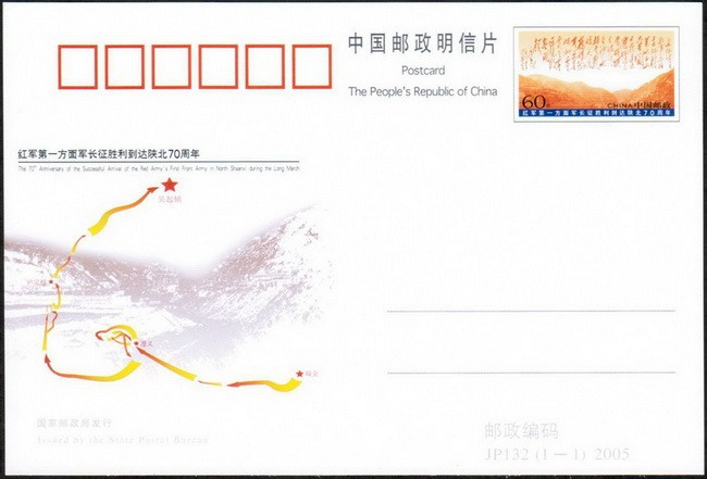 2005年10月19日,在紅一方面軍到達陜北吳起鎮(zhèn)70周年紀念日到來之際,國家郵政局曾發(fā)行JP132《紅軍第一方面軍長征勝利到達陜北70周年》紀念郵資明信片1套1枚,郵資片的郵資圖案為毛澤東的《七律?長征》詩,郵資片主圖為紅一方面軍長征路線簡圖,路線圖起點是瑞金,終點為陜北吳起鎮(zhèn)。這枚紀念郵資明信片的發(fā)行,從側面證實了長征題材第一套郵票,紀念的是紅一方面軍勝利完成二萬五千里長征二十周年。