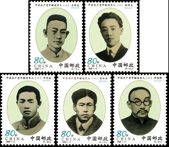 中國共產(chǎn)黨早期組織的創(chuàng)建者和早期領(lǐng)導(dǎo)人王盡美、趙世炎、鄧恩銘、蔡和森、何叔衡,就是這些千千萬萬個共產(chǎn)黨員中的杰出代表。為深切緬懷這些革命先驅(qū)者的光輝業(yè)績,學(xué)習(xí)繼承和發(fā)揚他們的崇高精神,國家郵政局特于2001年6月28日發(fā)行了《中國共產(chǎn)黨早期領(lǐng)導(dǎo)人(一)》郵票一套5枚。