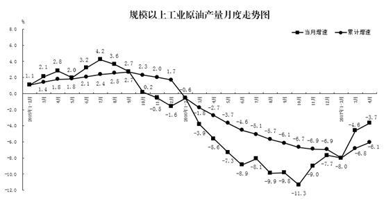 原油生產(chǎn)降幅收窄,進口增長較快。4月份,原油產(chǎn)量1599.0萬噸,同比下降3.7%,降幅比3月份收窄0.9個百分點。1-4月份,原油產(chǎn)量6400.9萬噸,同比下降6.1%。進口13912萬噸,同比增長12.5%。