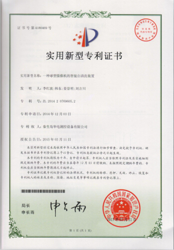 公司于2014年12月03日提交的“一種球型攝像機(jī)的智能自清洗裝置”專利已被中華人民共和國國家知識(shí)產(chǎn)權(quán)局頒發(fā)專利證書。