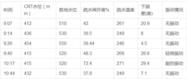 1號機組大修后,發(fā)現(xiàn)1號高加至2號高加疏水管道發(fā)生明顯晃動,為了徹底查詢管道振動的原因,采取有效解決措施,進行1號高加水位變動試驗。數(shù)據(jù)如下表: