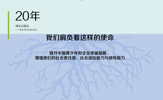 起心動念:緣起創(chuàng)始人黃榮華女士早年經(jīng)歷,參考美國培養(yǎng)下一代的方式,與熱心義工一同創(chuàng)辦“成長心連心”公益活動,1995年春天,萌芽于湖南!