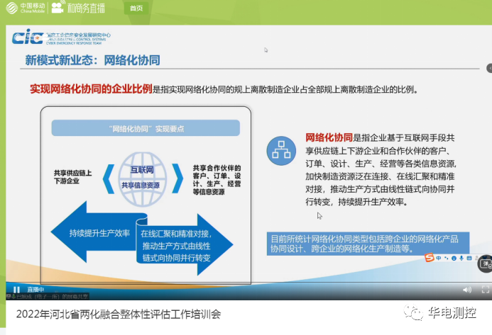 2022年4月27日,為進一步落實《河北省信息化與工業(yè)化深度融合發(fā)展“十四五”規(guī)劃》要求,全面掌握我省工業(yè)企業(yè)與重點特色產(chǎn)業(yè)集群兩化融合現(xiàn)狀和發(fā)展趨勢,推動新一代信息技術(shù)與實體經(jīng)濟深度融合,促進企業(yè)轉(zhuǎn)型升級、提質(zhì)增效,河北省工作和信息化廳組織開展《2022年兩化融合整體性評估工作培訓(xùn)》會議,各市、縣(區(qū))工信部門兩化融合相關(guān)負責人,規(guī)模以上工業(yè)企業(yè)、“專精特新”中小企業(yè)等信息化負責人參加。華電測控集團經(jīng)管管理部副經(jīng)理賁偉、鄭穎參加了此次培訓(xùn)。