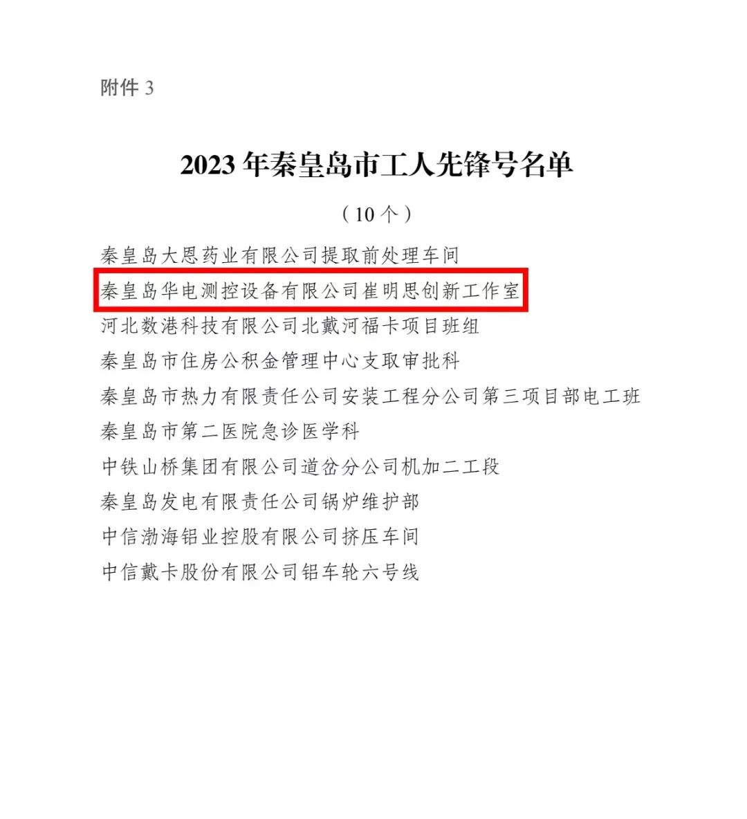 日前,秦皇島市總工會《關于授予2023年秦皇島市五一勞動獎和秦皇島市工人先鋒號的決定》(秦工字﹝2023﹞36 號)文件知悉,秦皇島華電測控設備有限公司“崔明思創(chuàng)新工作室”榜上有名,被秦皇島市總工會授予2023年秦皇島市工人先鋒號。