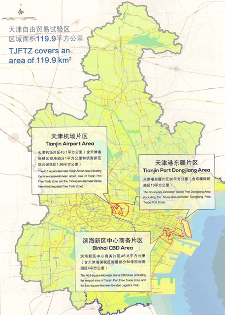 天津自貿(mào)區(qū)2014年12月31日獲國務(wù)院正式批復(fù),2015年4月21日正式掛牌,總面積119.9平方公里,是我國北方第一個自貿(mào)試驗區(qū),也是繼上海成立自貿(mào)區(qū)以來,與福建、廣東同時獲批的第二批自由貿(mào)易試驗區(qū)之一。其產(chǎn)業(yè)定位涵蓋了面積30平方公里,以發(fā)展航運物流、國際貿(mào)易、融資租賃等現(xiàn)代服務(wù)業(yè)為主的天津港東疆片區(qū);面積43.1平方公里,以發(fā)展高端制造業(yè)和與之配套的生產(chǎn)性服務(wù)業(yè)為主的天津機場片區(qū);面積46.8平方公里,以發(fā)展金融創(chuàng)新為主的現(xiàn)代服務(wù)業(yè)濱海新區(qū)中心商務(wù)片區(qū)三個片區(qū)。