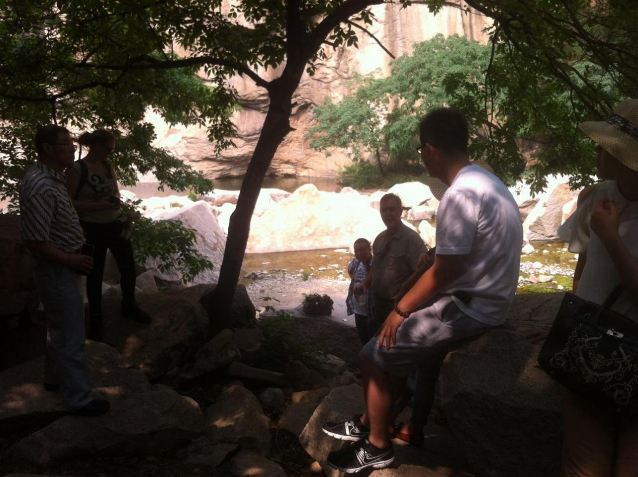 在公司總經(jīng)理劉吉川先生的引領(lǐng)下,邁克、安娜等一行八人攀登了長壽山景區(qū)的九重天山峰,穿越一線天,駐足山巔,登高望遠,邁克和安娜無不為眼前這雄偉壯觀的風(fēng)景所驚嘆。隨后,又依次參觀了懸陽洞、神醫(yī)石窟、壽字碑林等景區(qū),領(lǐng)略其中的歷史文化和人文精神。在山底的一堆巖石中,劉總帶領(lǐng)邁克和安娜見證了“生命的力量”,這是一棵從亂石崗中生長出來的大樹,它為了生存,需要更大的力量去向下生根以獲取水源,向上攀爬以獲取陽光,用自己的生命高度地詮釋了“夾縫中求生存”,這種生命的力量激勵著劉總用更大的勇氣和信心去建設(shè)華電測控。美國友人邁克感同身受,感慨道:“No pain, no gain.”(譯文:沒有痛苦,就沒有收獲)。安娜則對中醫(yī)文化情有獨鐘,劉吉川先生向她講解了刮骨療傷的故事,并借著李時珍、華佗等神醫(yī)石窟的雕像,概述了中國中醫(yī)文化的歷程。安娜不時地給雕像和碑文拍照,并把劉總的講解記錄在了她的日記本中,安娜說她回國后馬上就要開始讀醫(yī)學(xué)的研究生,劉總生動的講解激發(fā)了她對醫(yī)學(xué),特別是中醫(yī)學(xué)的興趣,真是起到了拋磚引玉的作用。