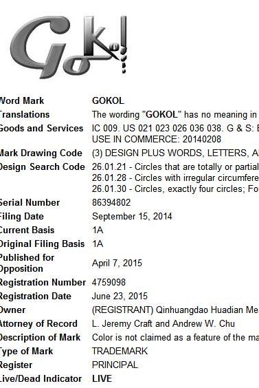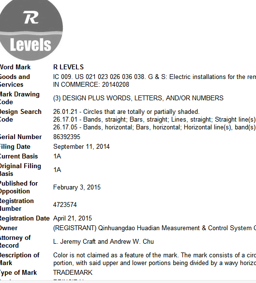 為了開拓美國市場,將公司產(chǎn)品盡快銷往美國,2014年9月,公司正式將鍋爐汽包水位測量與保護(hù)系統(tǒng)(R-Levels)和煤倉綜合管理系統(tǒng)(Gokol)兩個(gè)商標(biāo)向美國商標(biāo)局提交正式申請(qǐng)注冊(cè)文件,經(jīng)美國商標(biāo)局嚴(yán)謹(jǐn)審核認(rèn)證,近日已經(jīng)獲美國商標(biāo)局的正式注冊(cè)。