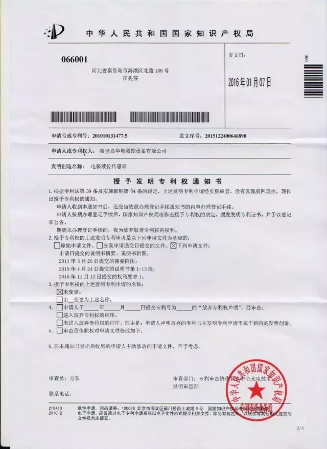 新年伊始,佳音頻傳。公司于2010年2月26日提交的“電極液位傳感器”專利已被中華人民共和國國家知識產(chǎn)權(quán)局授權(quán)發(fā)明專利權(quán)。