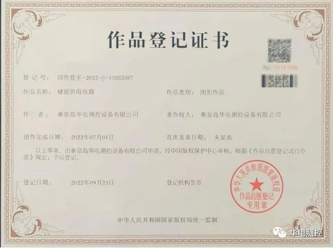 熱烈祝賀華電測(cè)控知識(shí)產(chǎn)權(quán)再添一員” 2022-10-262022年9月26日,秦皇島華電測(cè)控設(shè)備有限公司收到中華人民共和國(guó)國(guó)家版權(quán)局頒發(fā)的《儲(chǔ)能供電電路——作品登記證書(shū)》。