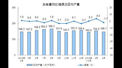 國家統(tǒng)計局:4月全國發(fā)電量4444億千瓦時下降1.7%” 2016-05-16中國電力網(wǎng)訊 (記者齊濤)5月14日,國家統(tǒng)計局發(fā)布數(shù)據(jù)稱, 2016年4月份規(guī)模以上工業(yè)增加值增長6.0%,其中,發(fā)電量4444億千瓦時,下降1.7%。 2016年4月份,規(guī)模以上工業(yè)增加值同比實際增長6.0%(以下增加值增速均為扣除價格因More