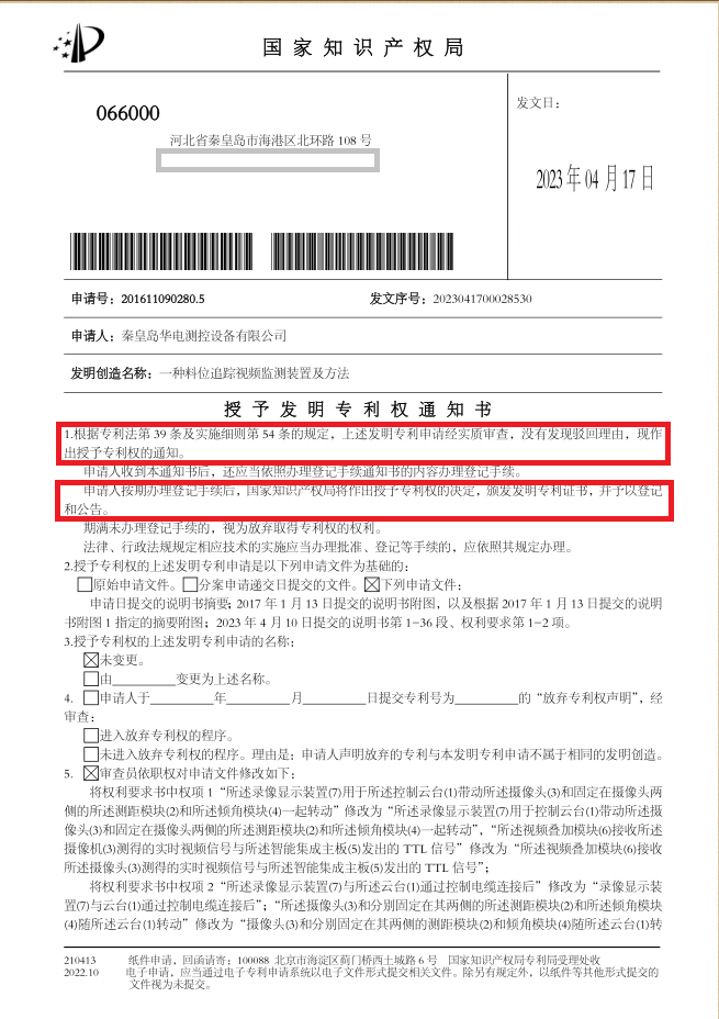 秦皇島華電測控設備有限公司又獲一項發(fā)明專利” 2023-06-07我公司發(fā)明專利《一種料位追蹤視頻檢測裝置及方法》(專利號201611090280.5)被國家知識產權局正式授予專利權?! ?023年4月17日,秦皇島華電測控設備有限公司收到國家知識產權More