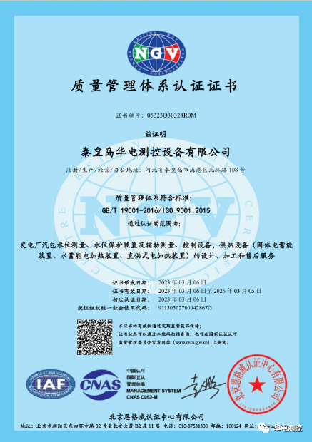 華電測(cè)控順利通過ISO9001質(zhì)量管理體系再認(rèn)證” 2023-03-072023年3月7日,秦皇島華電測(cè)控設(shè)備有限公司收到來自北京恩格威認(rèn)證中心頒發(fā)的《質(zhì)量管理體系認(rèn)證證書》,這表明華電測(cè)控2023年ISO9001質(zhì)量管理體系再認(rèn)證順利通過!秦皇島華電測(cè)More